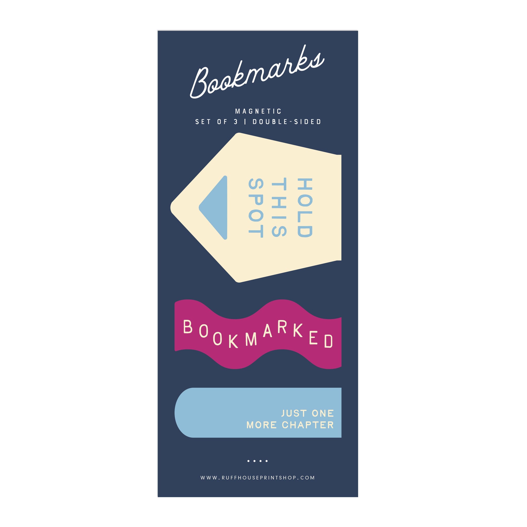 Cheerful, clever, and perfect for readers. Our Hold This Spot Magnetic Bookmark Set includes three double-sided magnetic bookmarks: a main arrow marker that points to your exact spot (even from the page edge!), a wavy bookmark that says “bookmarked,” and a slim bookmark that reads “just one more chapter.” Clip them onto your page to mark your place without bending corners.