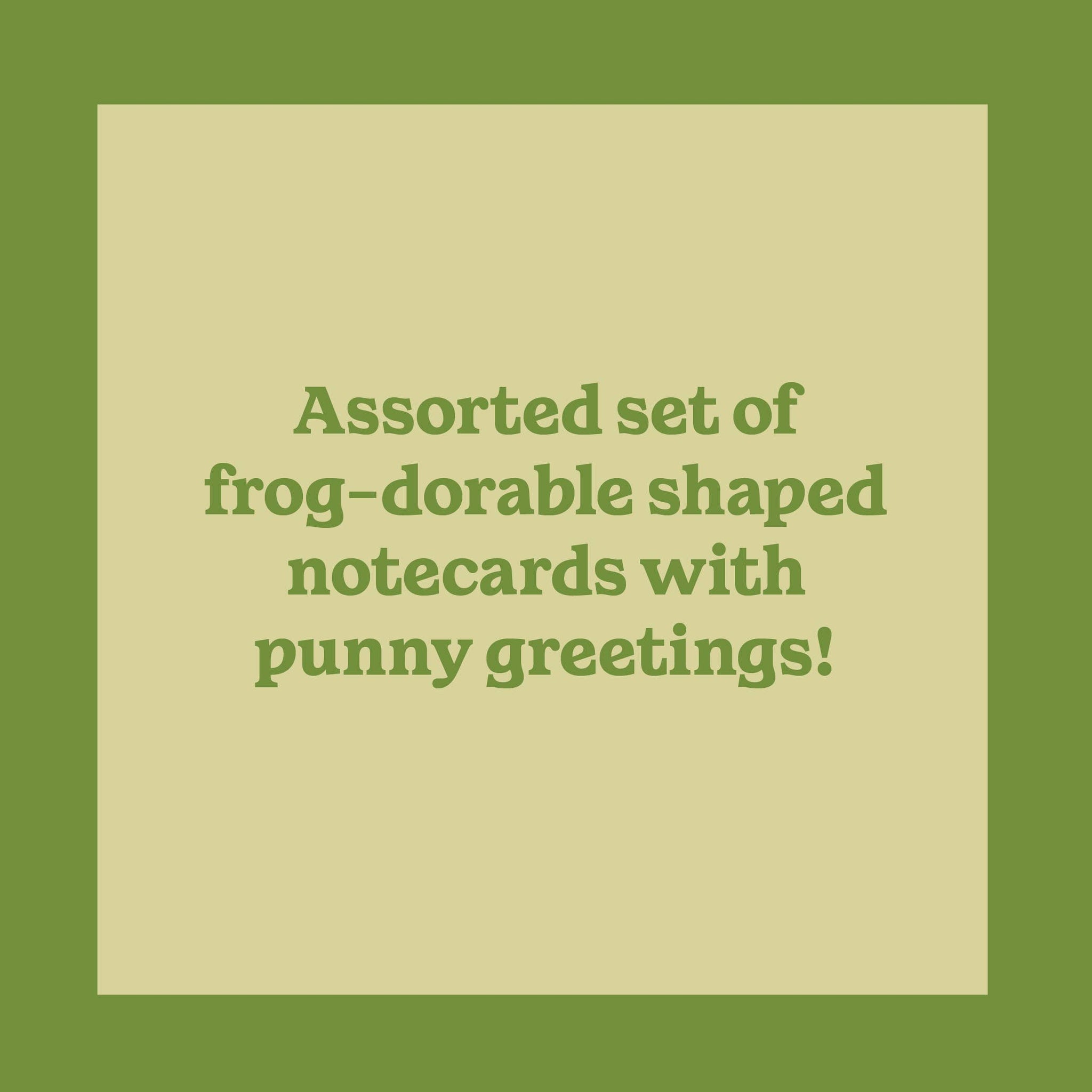 Add some quirky charm to your correspondence with these adorable frog-shaped notecards! These illustrated cards feature four different designs and punny greetings. From a wizard frog to a romantic frog, a bookish toad to a cowboy croaker, each of these playful amphibians will deliver your birthday wishes, congratulations, and cheerful ribbits to friends and family! The stationery set includes12 die-cut notecards (4 designs repeating) and 12 envelopes.