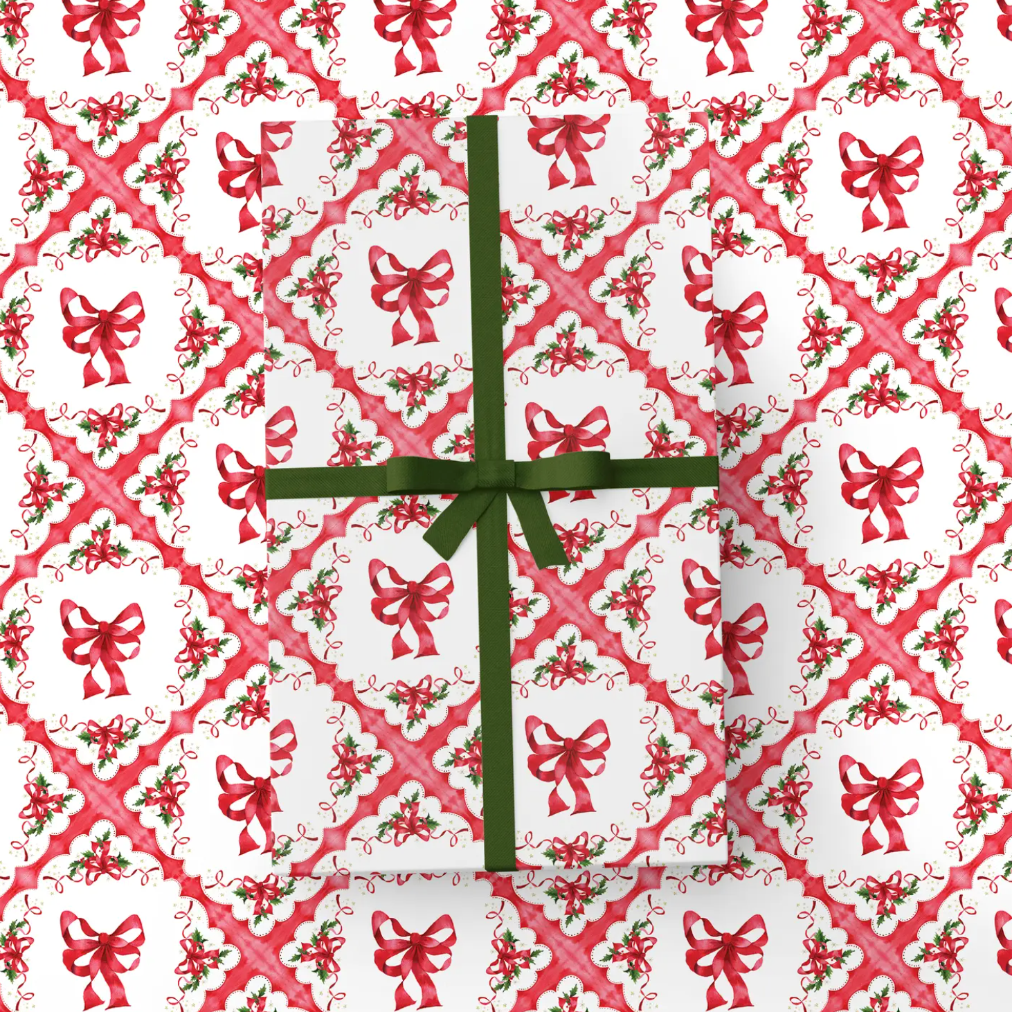 Wrap your gifts in a ribbon-tied dose of nostalgia! Our Vintage Bows Wrapping Paper is inspired by classic mid-century holiday tablecloths — the kind your grandma lovingly pulled out every December, complete with scalloped edges, holly sprigs, and candy-red ribbons galore.