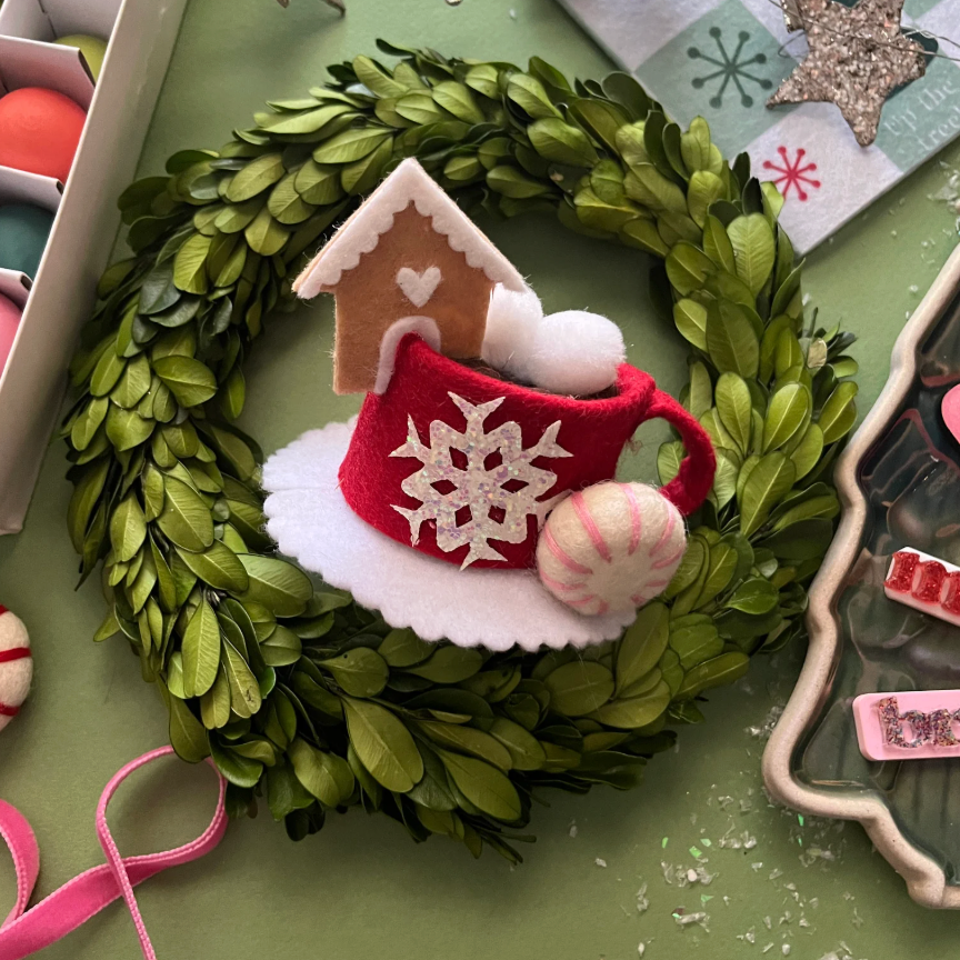 • Handmade felt gingerbread cookie, mints, candy canes inside a felt tea cup.