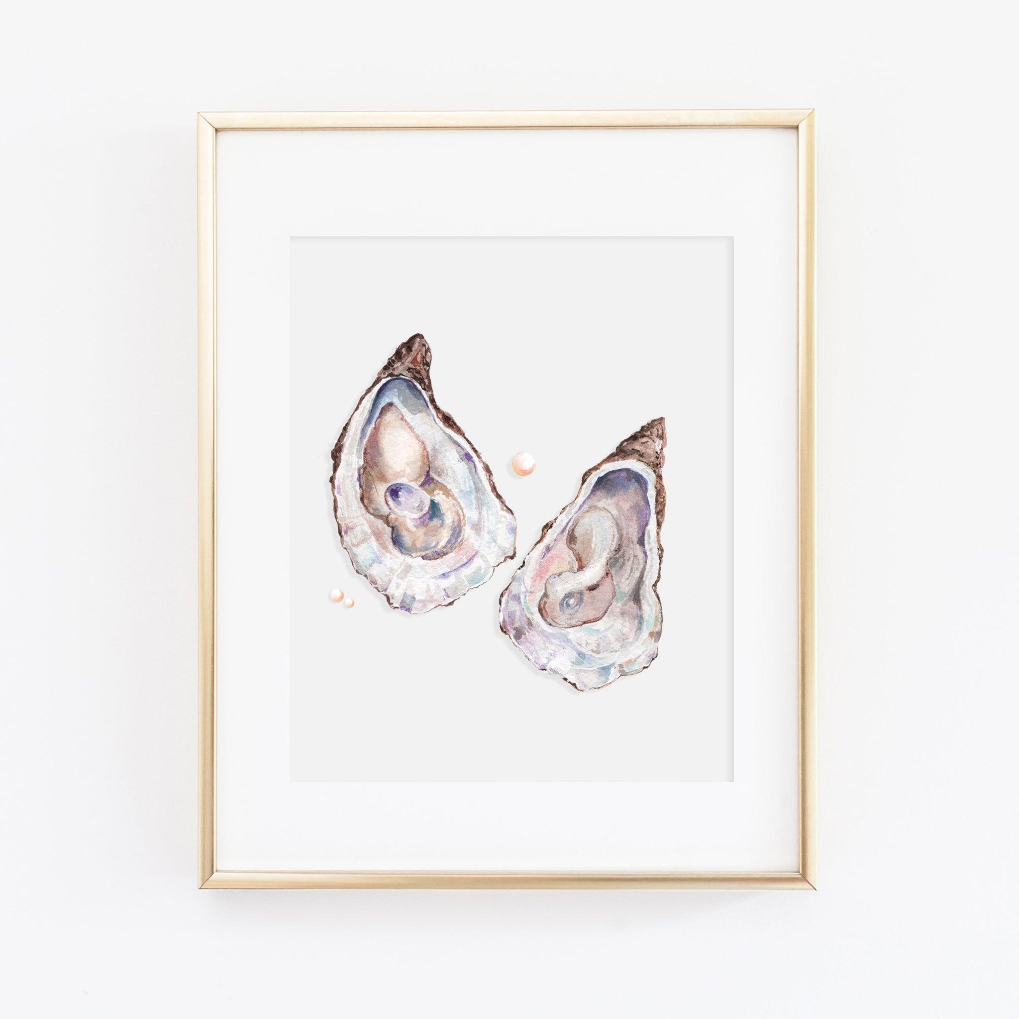 This watercolor oysters art print is a soft, elegant take on coastal wall art, featuring delicately painted oyster shells and shimmering pearls in a palette of blues, taupes, and lavender. Created by artist Cami Monet, this oyster shell wall print brings a painterly sense of calm and coastal sophistication to any space.