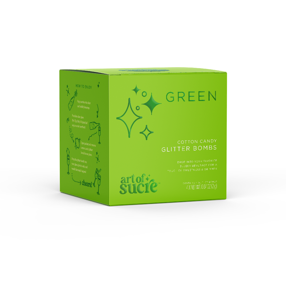 Our glitter bombs are hand-spun puffs of cotton candy with edible glitter inside. Once the cotton candy is dropped into your favorite clear, bubbly beverage, the cotton candy dissolves leaving your drink a magical, sparkly color and a touch sweeter. Be sure to give your drink a good stir to see the full effect of the glitter!
