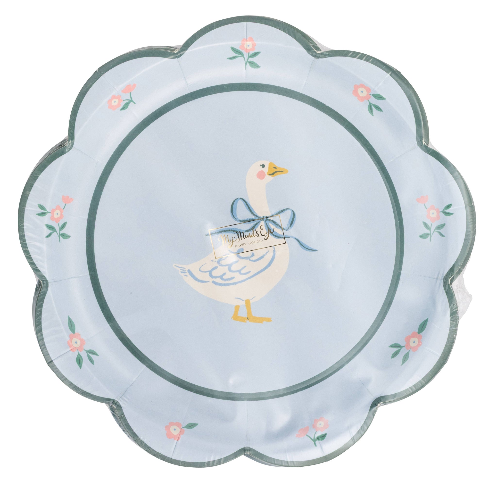 • Blue, pink, green, and cream Garden Goose round plate design