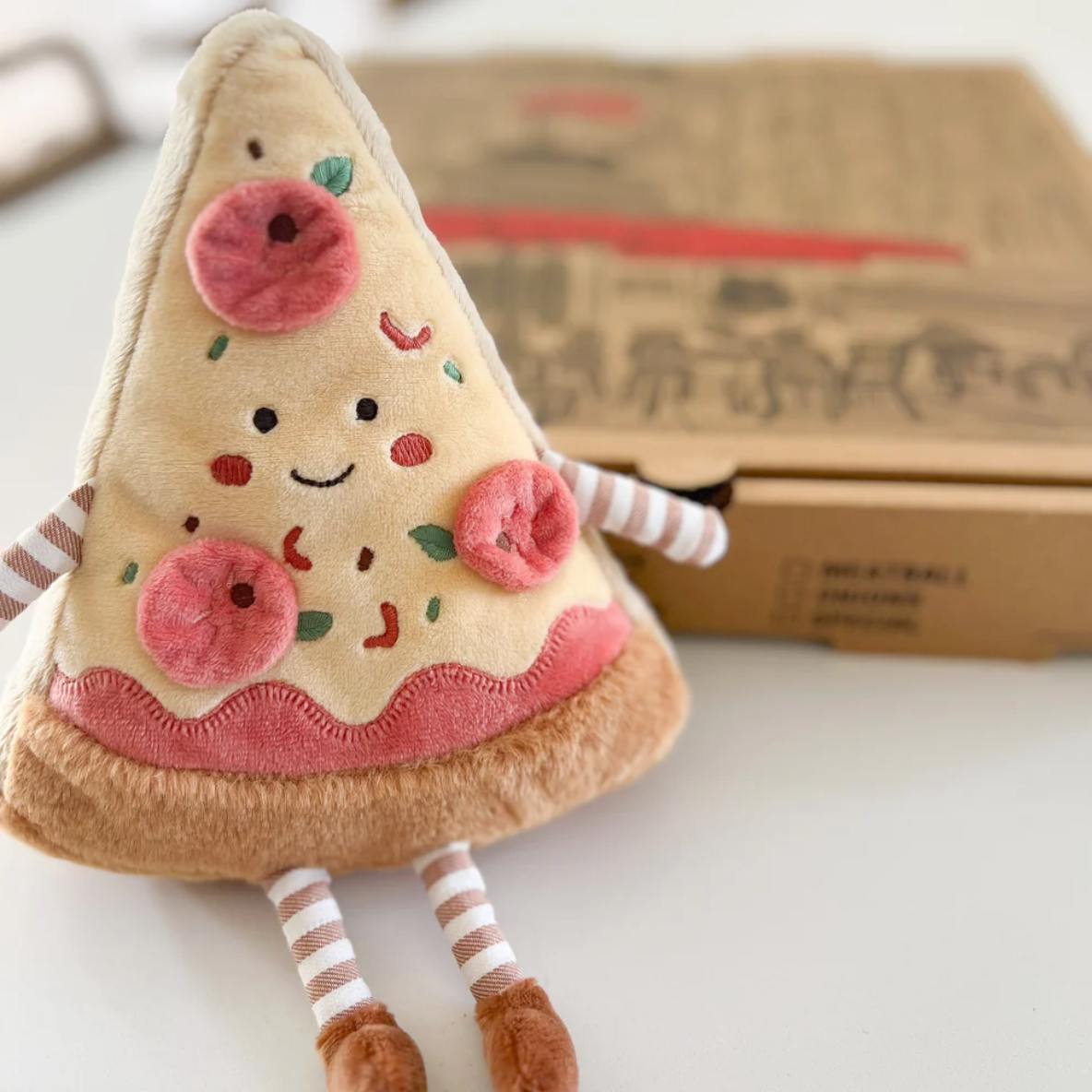 Mon Ami's Cosimo Pizza Slice will definitely steal a pizza your heart. This pizza slice is a wonderful wedge of yummy colors. Our soft plush pizza slice has embroidered features such as rosy cheeks, a sweet smile, whimsical striped arms & legs, tow-tone colored crust and topped with the classic pepperoni topping. A slice of playtime fun for all ages.?
